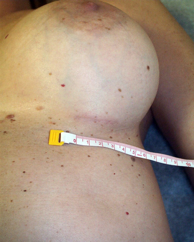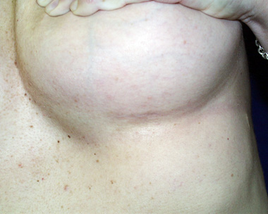 This woman has a low and side to side armpit incision that is not even in her armpit. She also has a breast implant infection on the underside of that breast.