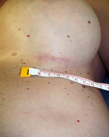 An example of well healed inframammary fold or breast crease access incision scars from breast augmentation. This is a 3 centimeter scar.Breast augmentation scars photos 9