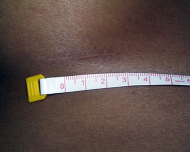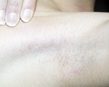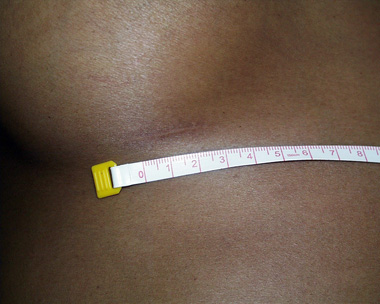 This is an example of the ‘under the breast’ or inframammary incision scar. This is a woman of darker color. She has healed without keloid.