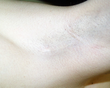 Armpit access incisions for breast augmentation can be placed up and down, or sideways. This is an example of the up and down incision.