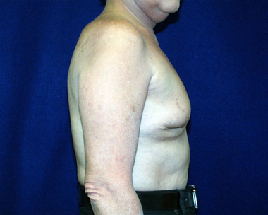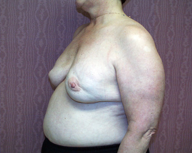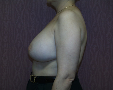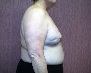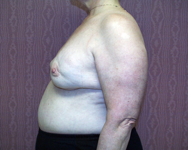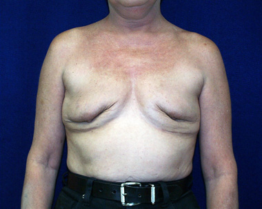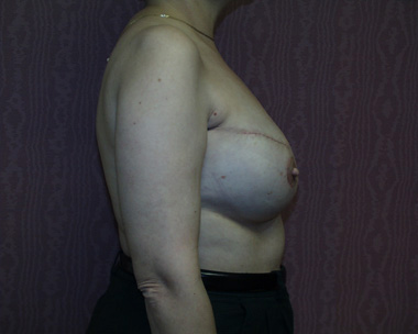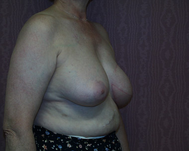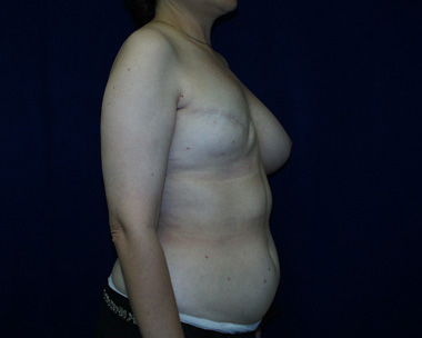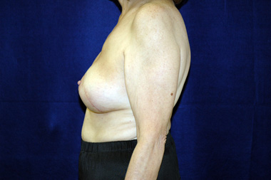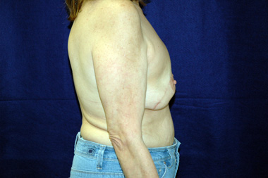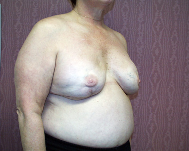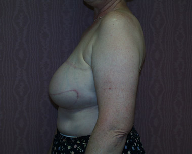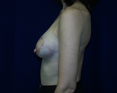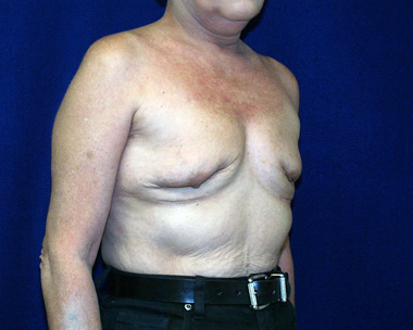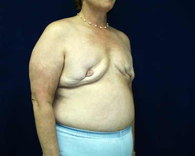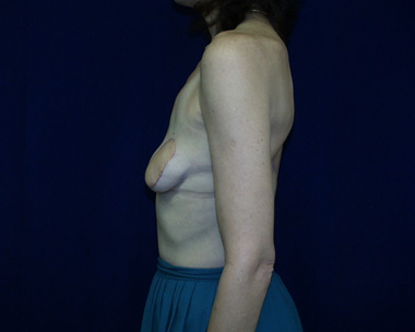 This woman had left breast cancer and underwent a right breast mastectomy. She elected to delay her breast reconstruction. She had her breast reconstruction done using one of her back muscles and a breast implant. She declined a second surgery for nipple reconstruction.