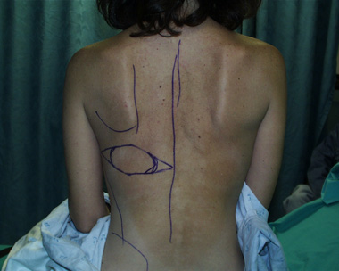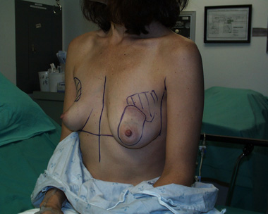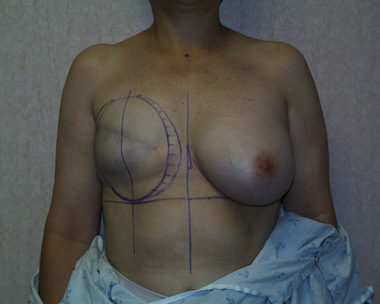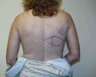 This woman developed right breast cancer and requested immediate reconstruction using her back muscle. She also had a breast implant placed at the same surgery as the breast removal. This way she never went without having a breast mound. The markings depict the skin that will be removed by the general surgeon (to include the breast biopsy site) and the skin/muscle taken from her back to reconstruct her new breast mound. She did not want a second surgery and declined nipple reconstruction.