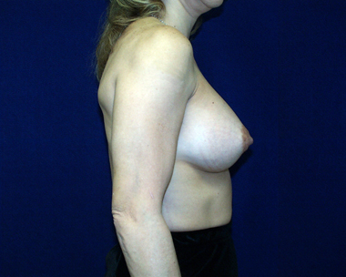 This woman has a very slight nipple position asymmetry. Notice how her after breast augmentation results on the profile views depict a slight upper pole fullness in her breast mounds. It is more noticeable on her left side.
