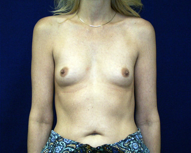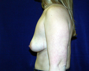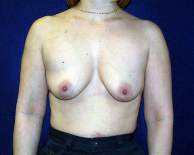 This woman has several different breast asymmetries that have been improved with her breast augmentation surgery. She is very pleased with her result. You can see from her translucent skin how her veins appear more prominent after breast augmentation. Over time, this typically lessens.