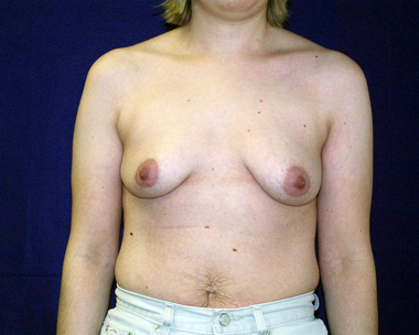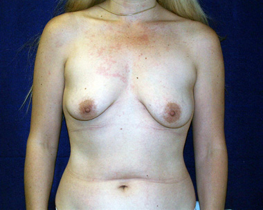 See how her breasts are shaped differently along the bottom. Her left breast has a long gentle curve to it and her right breast has a shorter curve that does not extend to the middle. Her breast shapes are much more symmetric after her breast implants have been placed. Note that her right nipple still points outward just a bit.