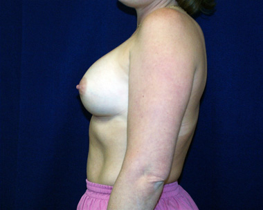 She has some very slight persistent upper pole fullness on these after breast implant photographs at one year out from her breast augmentation. It is more noticeable on her left profile view.