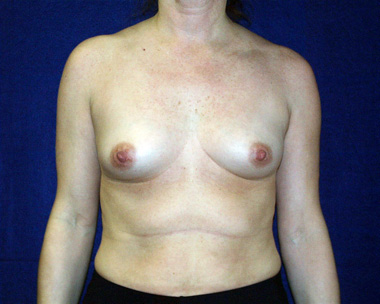 This young woman has nipple position and inframammary fold (breast crease) asymmetries. She also has a curvature in her spine. Note that on her after breast augmentation photos these characteristics still exist and that she has some upper pole fullness in both breasts.