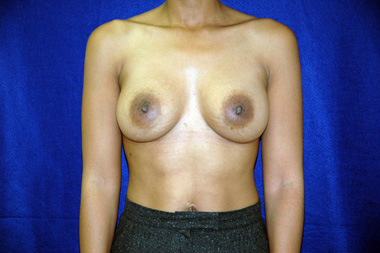 This woman had her breast augmentation done elsewhere. She was unhappy with her breast size and the scars being on her chest. She was delighted with her new larger breast implants and scar revisions. By using larger breast implants, the breast fold was lowered to hide the prior scar which was used by Dr. Brown.